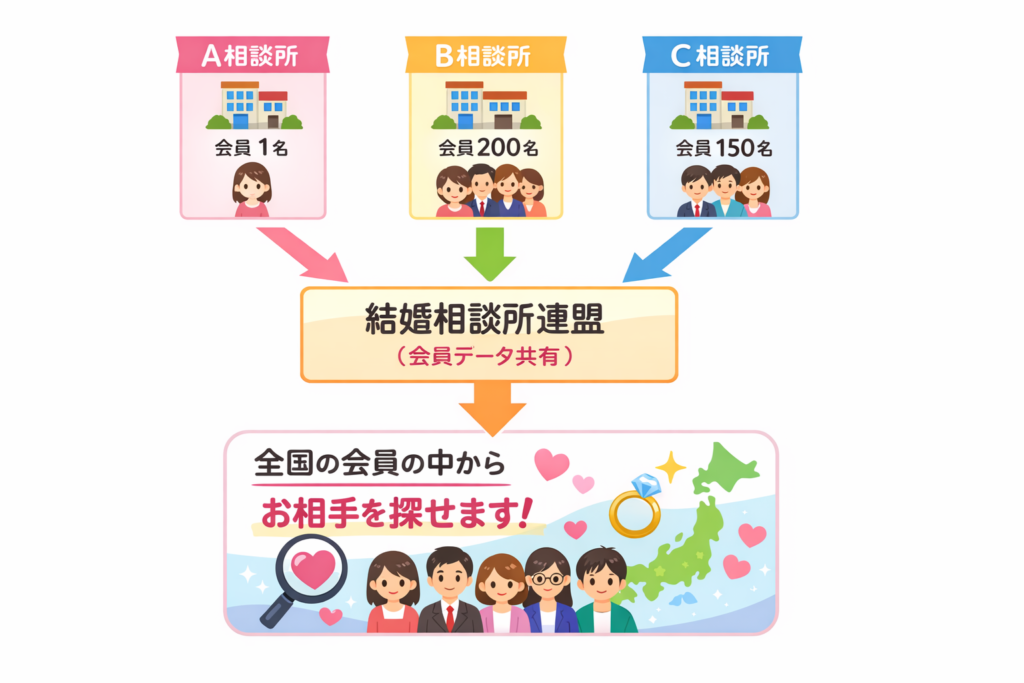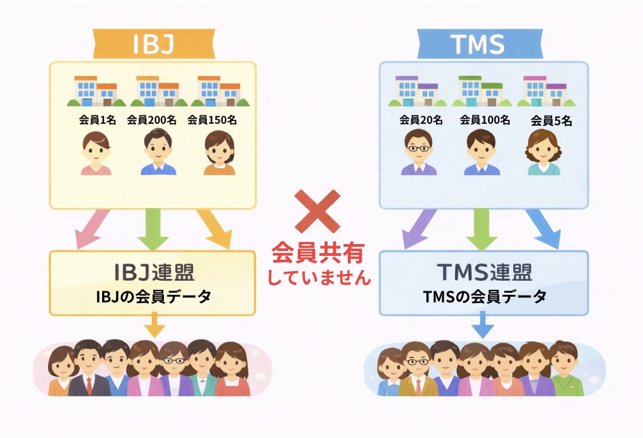 なぜなら、加盟している連盟ごとに会員が別れており、違う連盟の相談所とは会員を共有していないからです。